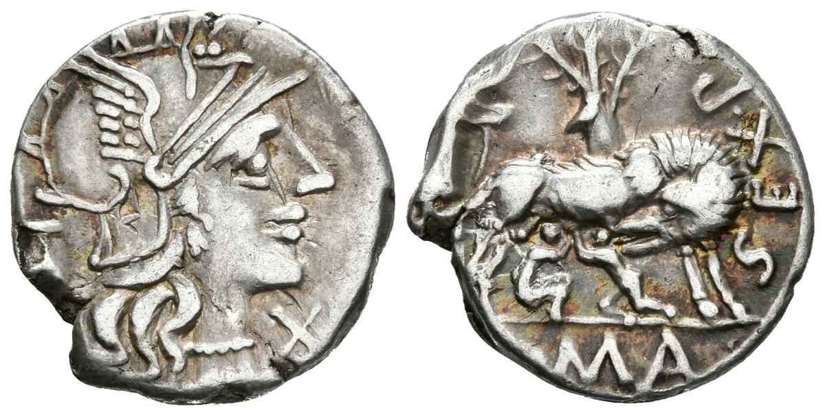 SEX. POMPEIUS FOSTLUS. Denario. 137 a.C. Roma. A/ Cabeza de Roma con casco a derecha, delante signo de valor X y detrás jarra. R/ Loba estante a derecha con cabeza vuelta, amamantando a Rómulo y Remo, detrás pastor junto a arbol de higuera con pájaros. SEX•PO FOSTLVS, en exergo ROMA. Craw 235.1c; Sydenham 461a; RSC Pompeia 1a. Ar. 3,80g. Pátina irisada. MBC/MBC+.