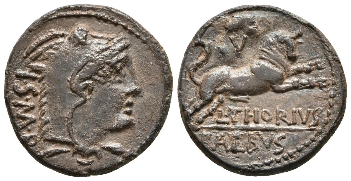 L. THORIUS BALBUS. Denario forrado. 105 a.C. Roma. A/ Busto de Juno Sospita a derecha, cubierta con piel de cabra, detrás I·S·M·R. R/ Toro a derecha con las patas delanteras levantadas, encima V y debajo L.THORIUS, en el exergo BALBUS. Craw 316.1; RSC Thoria 1. Ar/Ae. 3,60g. Bonita pátina. MBC+.