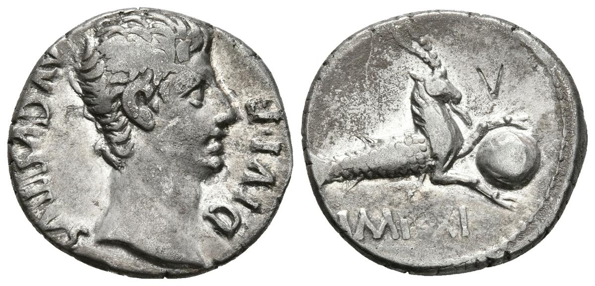 AUGUSTO. Denario. 27 a.C.-14 d.C. Lugdunum. A/ Busto desnudo de Augusto. AVGVSTVS DIVI·F. R/ Capricornio a derecha sosteniendo globo entre sus patas delanteras, en exergo IMP XI. BMC 465; Cohen 147; RIC 174. Ar. 3,68g. MBC+/MBC.