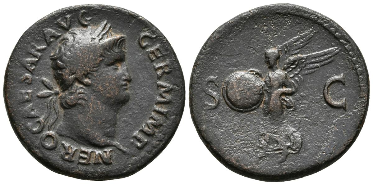 NERON. As. 64-67 d.C. Lugdunum. A/ Cabeza laureada a derecha. IMP NERO CAESAR AVG P MAX TR P P P. R/ Victoria avanzando a izquierda portando escudo con inscripción SPQR, a ambos lados S-C. RIC 543; BMCRE 381. Ae. 10,37g. MBC-.