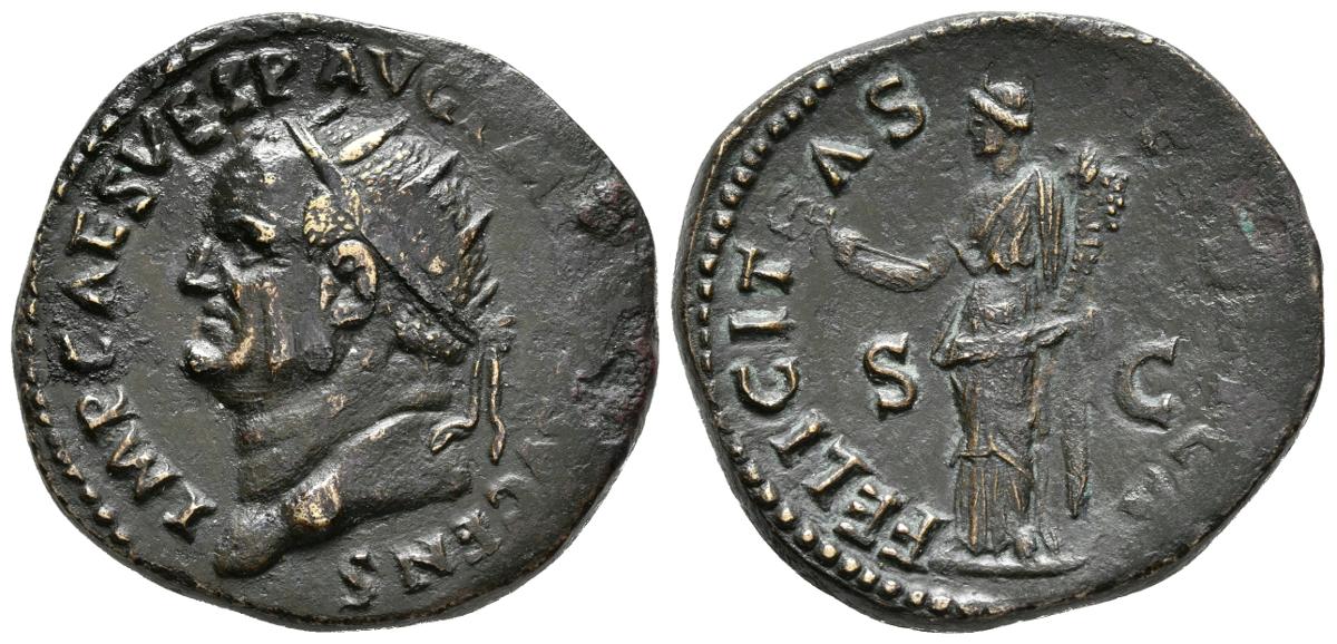 VESPASIANO. Dupondio. 74 d.C. Roma. A/ Cabeza radiada a izquierda. IMP CAES VESP AVG P M T P COS V CENS. R/ Felicitas estante a izquierda portando caduceo y cornucopia, a los lados S C. FELICITAS PVBLICA. RIC 716. Ae. 14,15g. Vano de acuñación. EBC-.