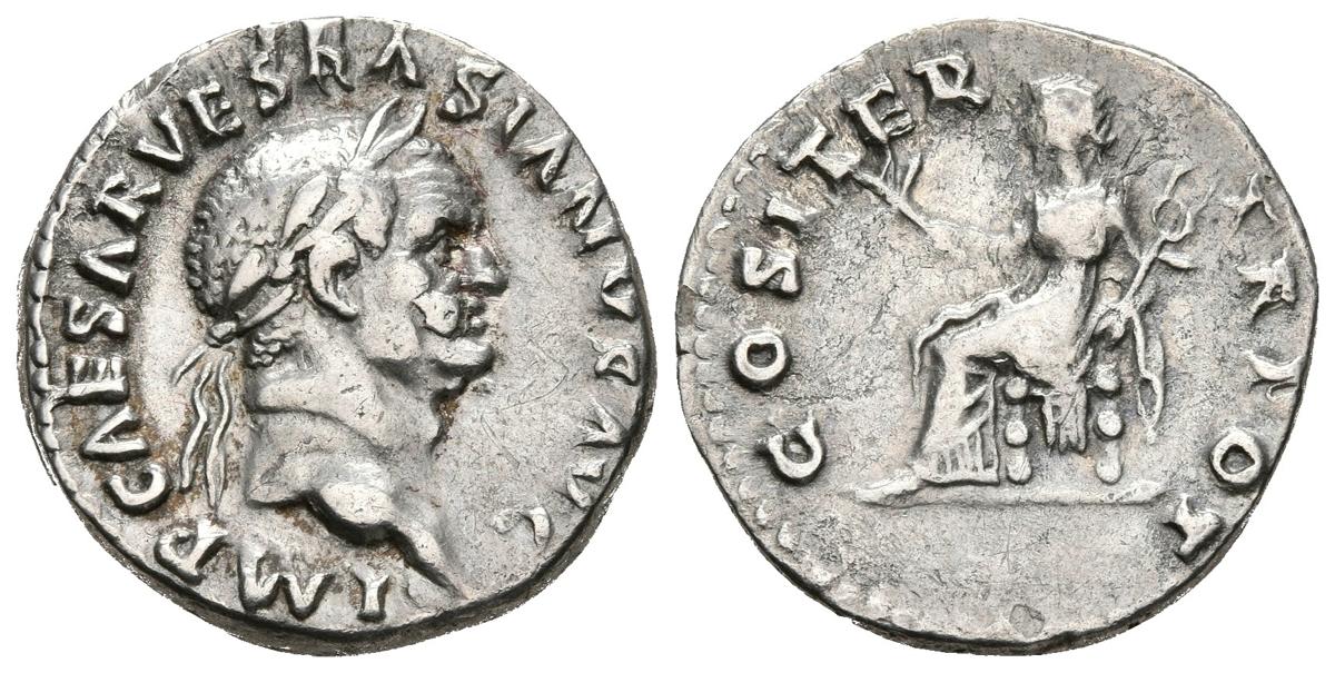 VESPASIANO. Denario. 69-79 d.C. Roma. A/ Cabeza laureada a derecha. IMP CAESAR VESPASIANVS AVG. R/ Pax sedente a izquierda portando rama y caduceo. COS ITER TR POT. BMC 26; RIC 29. Ar. 3,31g. Rayita en anverso. MBC+/MBC.
