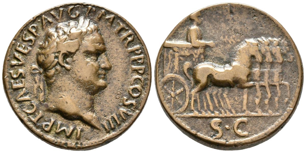 TITO. Medallón, COPIA PADUANA por Giovanni Cavino. 1500-1570. A/ Busto laureado a derecha. IMP T CAESAR VESP AVG PM TR P P P COS VIII. R/ Cuádriga a derecha. Klawans 6. Ae. 23,94g. 32mm. MBC+.
