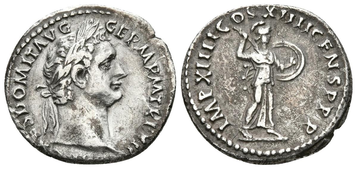 DOMICIANO. Denario. 88-89 d.C. Roma. A/ Busto laureado a derecha. IMP CAES DOMIT AVG GERM PM TR P XV. R/ Minerva estante a derecha portando lanza y escudo. IMP XIIII COS XIIII CENS P P P. RIC 504; BMCRE 101; RSC 217. Ar. 3,13g. Algo frotada en anverso. MBC+.