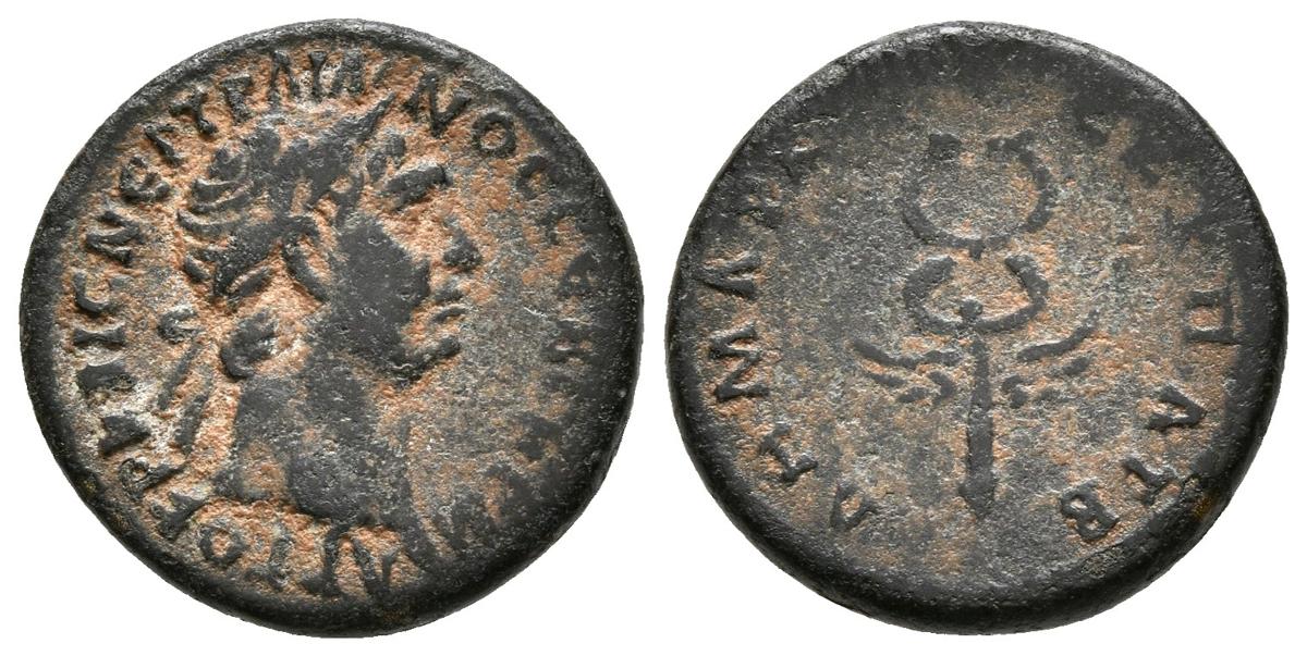 TRAJANO. Semis de Antioquia. 98-99 d.C. Acuñado en Roma para circular en el Este. A/ Busto laureado a derecha. R/ Cadudeco alado. RPC III 3658; McAlee 501. Ae. 2,56g. MBC. Escasa.