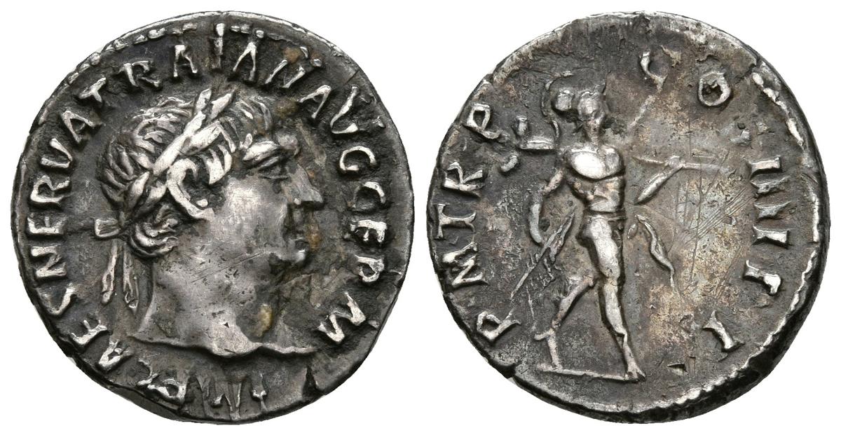 TRAJANO. Denario. 101-102 d.C. Roma. A/ Busto laureado a derecha. IMP CAES NERVA TRAIAN AVG GERM. R/ Marte avanzando a derecha portando lanza y trofeo. P M TR P COS IIII P P. RIC 52; BMCRE 94; RSC 228. Ar. 3,09g. MBC.