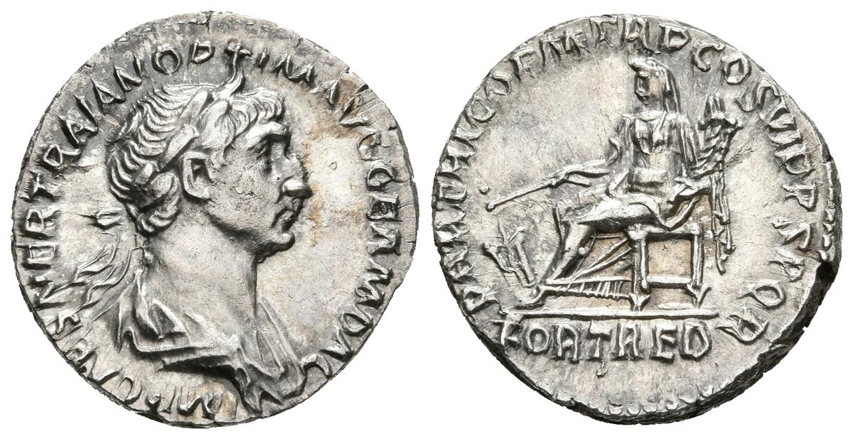 TRAJANO. Denario. 114-117 d.C. Roma. A/ Busto laureado y drapeado a derecha. IMP CAES NER TRAIANO OPTIM AVG GERM DAC. R/ Fortuna sedente a izquierda, portando cetro, cornucopia y timón. P M TR P COS VI P P S P Q R, enxergo FORT RED. RIC 318; Woytek 526f; RSC 154b. Ar. 3,39g. EBC.Ex HD Rauch 11, 12/09/2006. Nº743.