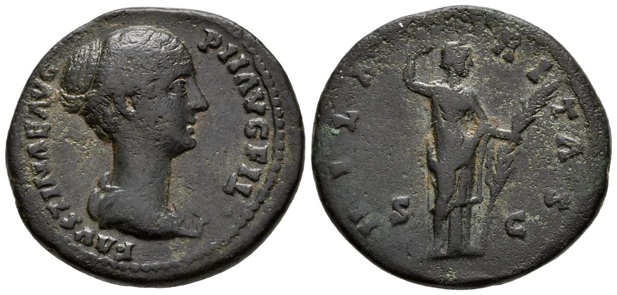 FAUSTINA II. As. 147-175 d.C. Roma. A/ Busto drapeado a derecha. FAUSTINAE AVG PII AVG FIL. R/ Hilaritas estante a derecha tocandose el cabello y portando palma HILARITAS, en exergo S C. RIC III 1396b (Pius). Ae. 11,18g. MBC-.