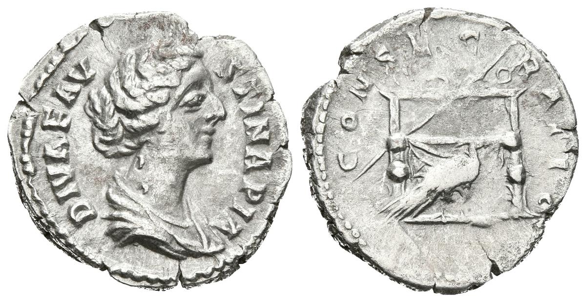 FAUSTINA II. Denario. 176-180 d.C. Roma. A/ Busto drapeado a derecha. DIVA FAUSTINA PIA. R/ Trono cubierto sobre el que se apoya cetro, en su base pavo real a derecha. CONSECRATIO. RIC 745 (Aurelius); BMCRE 723 (Aurelius and Commodus). Ar. 3,26g. MBC+.