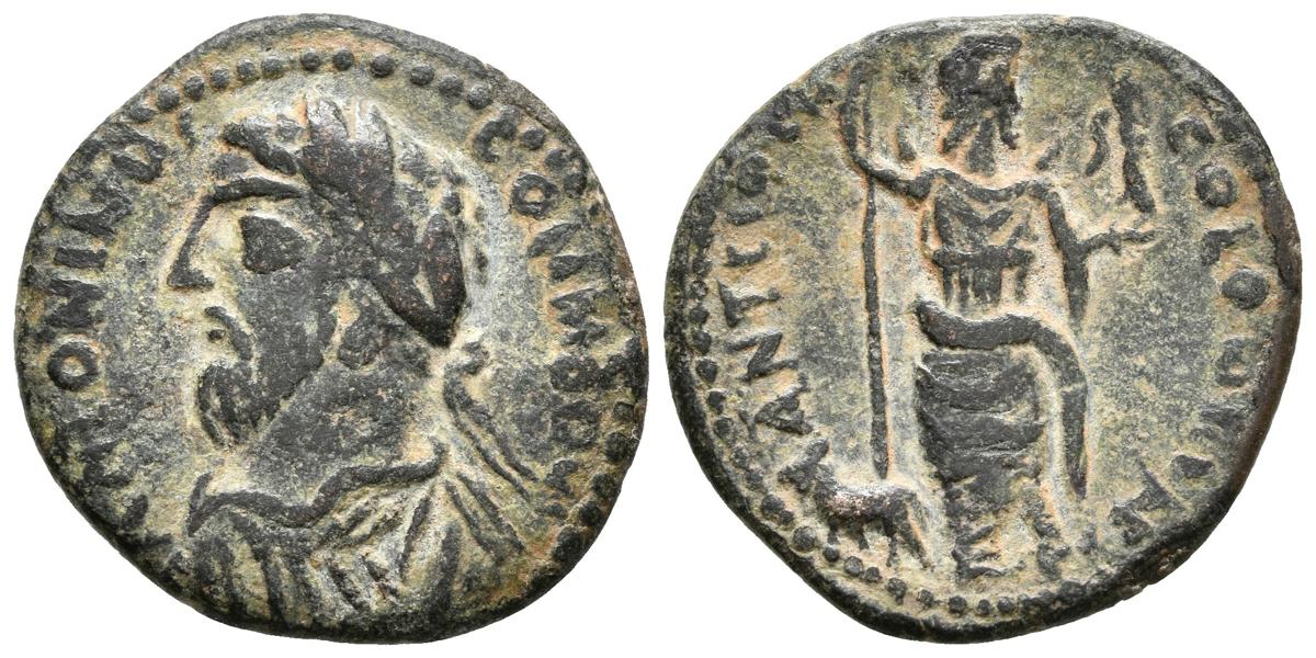 COMODO. Ae23. 117-180 d.C. Antioquía, Pisidia. A/ Busto laureado y drapeado con coraza a izquierda. ANTONINVS COMMODVS. R/ Hombre con gorro frigio estante a derecha, sosteniendo cetro grande y Victoria, a su izquierda cabra y apoyando su pie izquierdo en bucranium. ANTIOCH COLONIAE. RPC IV online 7377. Ae. 4,83g. MBC+.