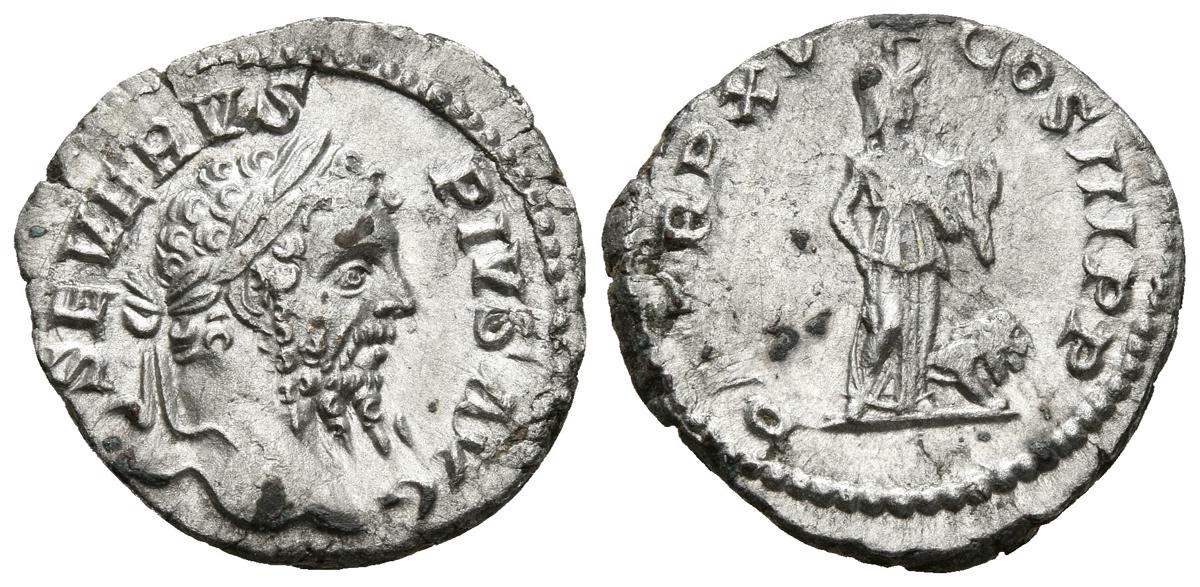 SEPTIMIO SEVERO. Denario. 207 d.C. Roma. A/ Busto laureado a derecha. SEVERVS PIVS AVG. R/ Africa estante a derecha con tocado de piel de elefante y frutas, a sus pies león. P M TR P XV COS III P P. RIC 207. Ar. 3,61g. EBC/MBC+.