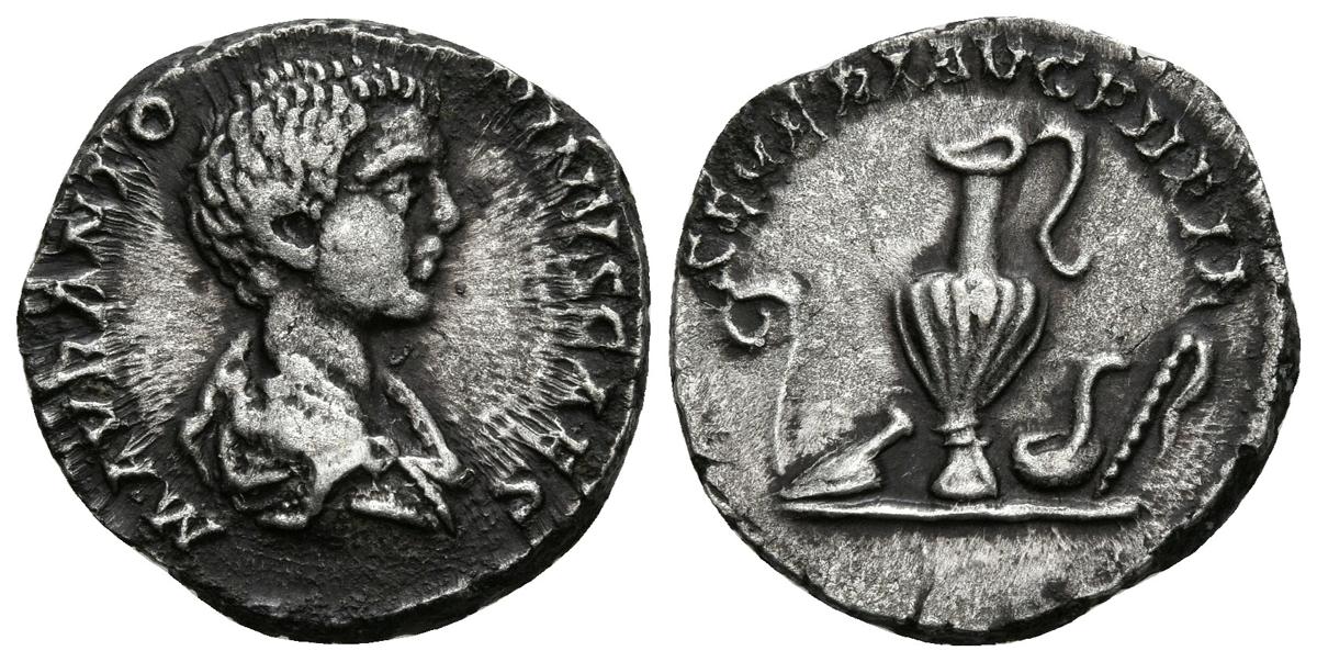 CARACALLA. Denario. 196-197 d.C. Roma. A/ Busto drapeado a derecha. M AVR ANTONINVS CAES. R/ Objetos sacerdotales: Lituus, cuchillo, pátera, aspergillum y simpulum. SEVERI AVG PII FIL. RIC 4 (Severus); BMCRE 184; RSC 587. Ar. 3,36g. MBC+.