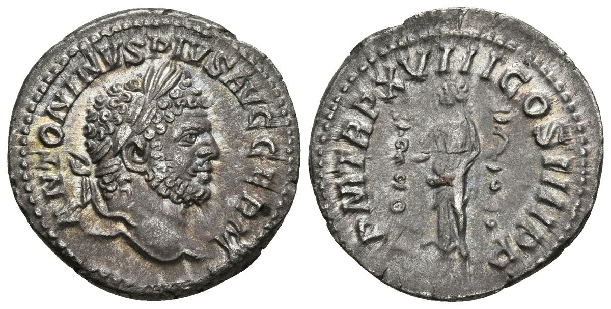 CARACALLA. Denario. 215 d.C. Roma. A/ Cabeza laureada a derecha. ANTONINVS PIVS AVG GERM. R/ Fides Militum estante a izquierda, portando dos estandartes. P M TR P XVIII COS IIII P P. RIC 266; RSC 315. Ar. 3,25g. Bonito tono irisado. EBC/MBC+Ex Paul Munro-Walker Collection.