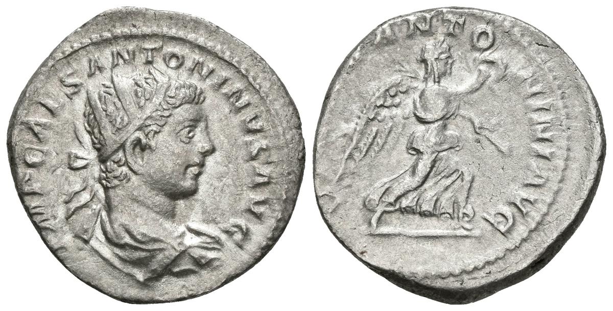 HELIOGABALO. Antoniniano. 218 d.C. Roma. A/ Busto radiado y drapeado con coraza a derecha. IMP CAES ANTONINVS AVG. R/ Victoria en marcha a derecha portando corona y palma. VICTOR ANTONINI AVG. RIC 155. Ar. 4,72g. MBC.