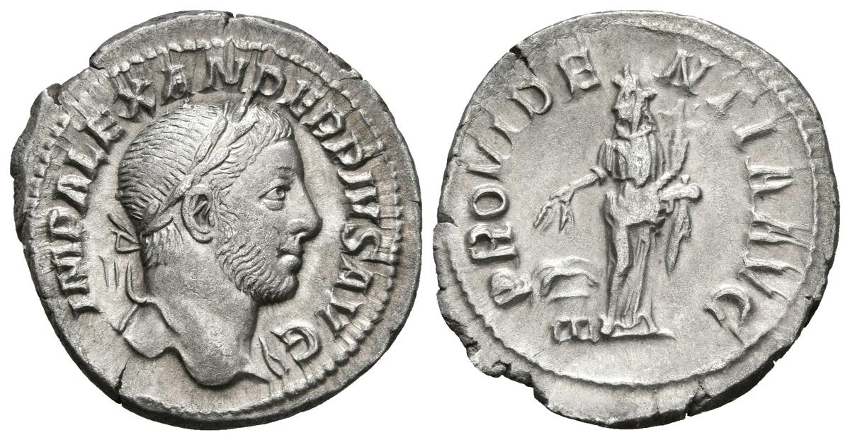ALEJANDRO SEVERO. Denario. 221-235 d.C. Roma. A/ Busto laureado a derecha con ligero drapeado sobre el hombro izquierdo. IMP ALEXANDER PIVS AVG. R/ Providentia estante a izquierda portando cornucopia y espigas con granos sobre modio. PROVIDENTIA AVG. BMC 875; Cohen 501var (draped); RIC 250. Ar. 3,35g. EBC-.Ex Aureo & Calicó 314 Nº2195.