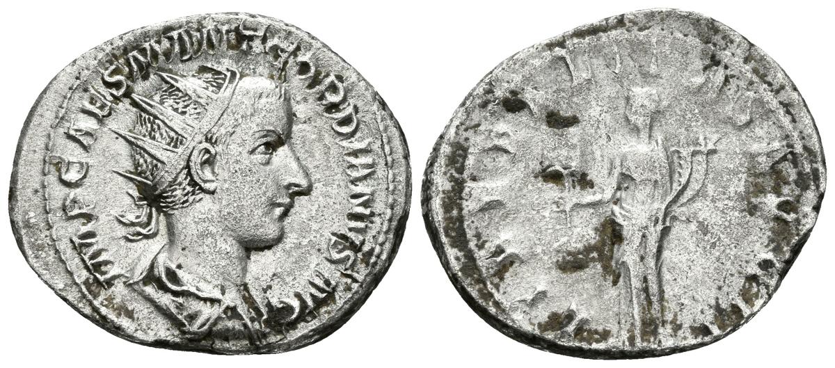 GORDIANO III. Antoniniano. 239-240 d.C. Roma. A/ Busto radiado y drapeado con coraza a derecha. IMP GORDIANVS PIVS FEL AVG. R/ Liberalitas estante a izquierda portando ábaco y doble cornucopia. LIBERALITAS AVG III. RIC 36. Ar. 4,99g. MBC+/MBC-.