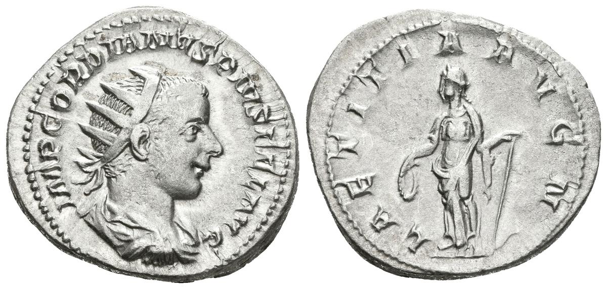 GORDIANO III. Antoniniano. 238-244 d.C. Roma. A/ Busto radiado y drapeado con coraza a derecha. IMP GORDIANVS PIVS FEL AVG. R/ Laetitia estante a izquierda portando corona y antorcha. LAETITIA AVG N. RIC 86; RSC 121. Ar. 4,11g. MBC+.
