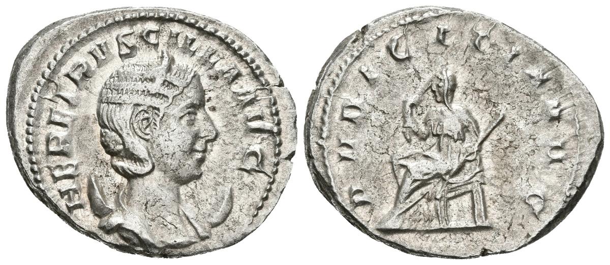 HERENNIA ETRUSCILLA. Antoniniano. 249-251 d.C. Roma. A/ Busto drapeado sobre creciente a derecha. HER ETRVSCILLA AVG. R/ Pudicitia sedente a izquierda portando cetro y sujetando su velo. PVDICITIA AVG. RIC 59b; RSC 19. Ar. 5,24g. MBC+.