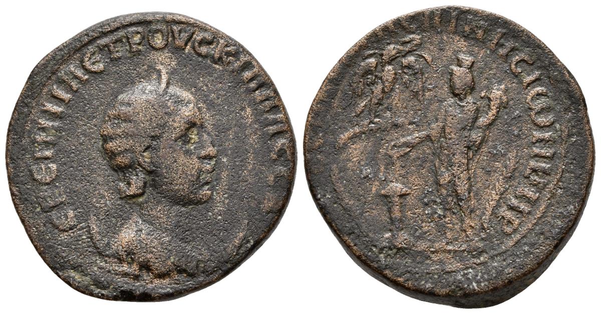 HERENNIA ETRUSCILLA. Ae 22. 249-251 d.C. Mesopotamia, Rhesaena. A/ Busto drapeado sobre creciente a derecha. R/ Tyche con kalathos a izquierda, portando cornucopia y sacrificando sobre altar en llamas, frente a ella águila sobre rama de árbol y sosteniendo corona en el pico. RPC 1587 var?. Ae. 12,36g. MBC-. Rara.