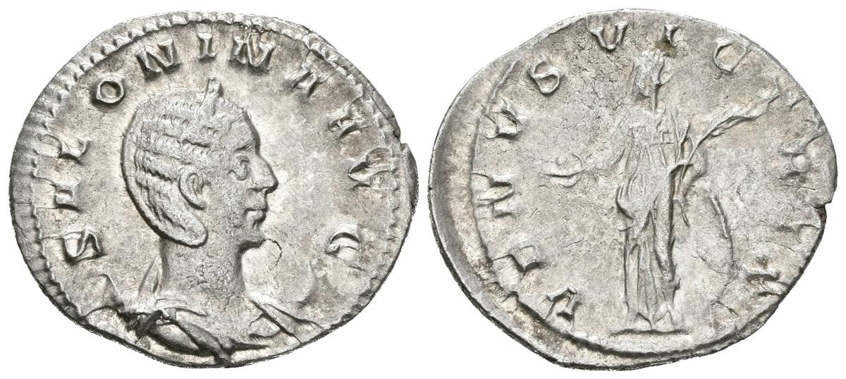 SALONINA. Antoniniano. 257-258 d.C. Colonia Claudia Ara Agrippinensium. A/ Busto con diadema y drapeado sobre creciente a derecha. SALONINA AVG. R/ Venus estante a izquierda portando manzana y palma. VENVS VICTRIX. RIC 68. Ar. 3,06g. MBC.Ex Paul Munro-Walker Collection.