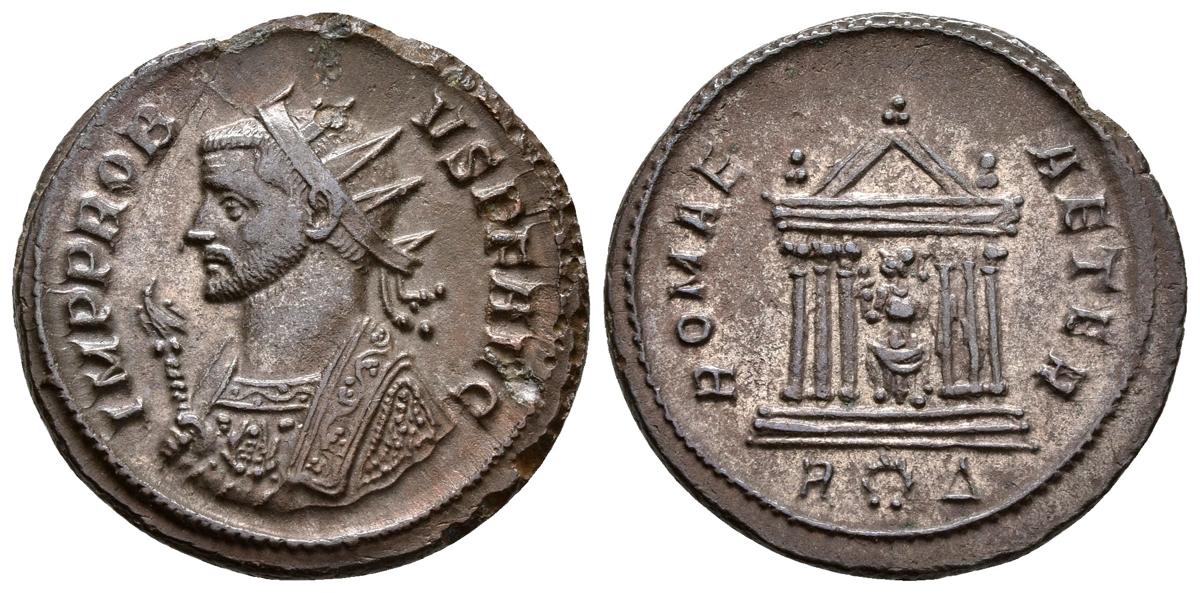 PROBO. Antoniniano. 276-282 d.C. Roma. A/ Busto radiado a izquierda, visitiendo manto imperial y portando cetro rematado en águila. IMP PROBVS P F AVG. R/ Roma sedente dentro de templo hexástilo, portando cetro y Victoria. ROMAE AETERNAE, en exergo R Corona Delta. RIC 185. Ae, 4,15g. EBC.Ex Col. Dattari.