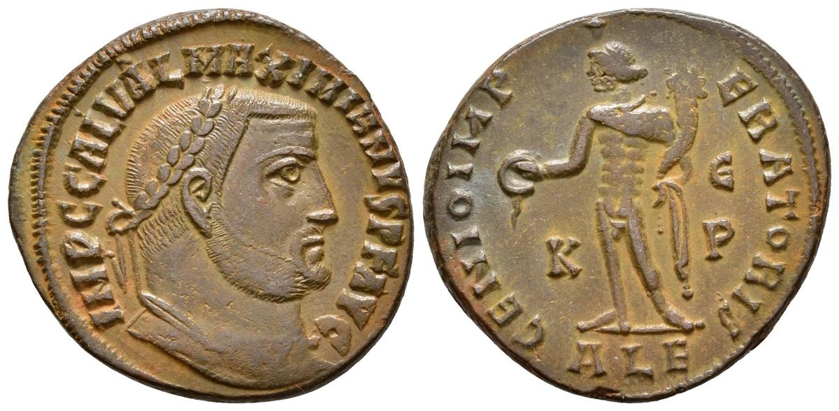 GALERIO. Follis. 308-310 d.C. Alexandría. A/ Busto laureado a derecha. IMP C GAL V MAXIMIANVS P F AVG. R/ Genio estante a izquierda portando pátera y cornucopia, a los lados K-Epsilon P. GENIO IMPERATORIS, en exergo ALE . RIC 101a. Ae. 7,88g. MBC+.Ex Col. Dattari.