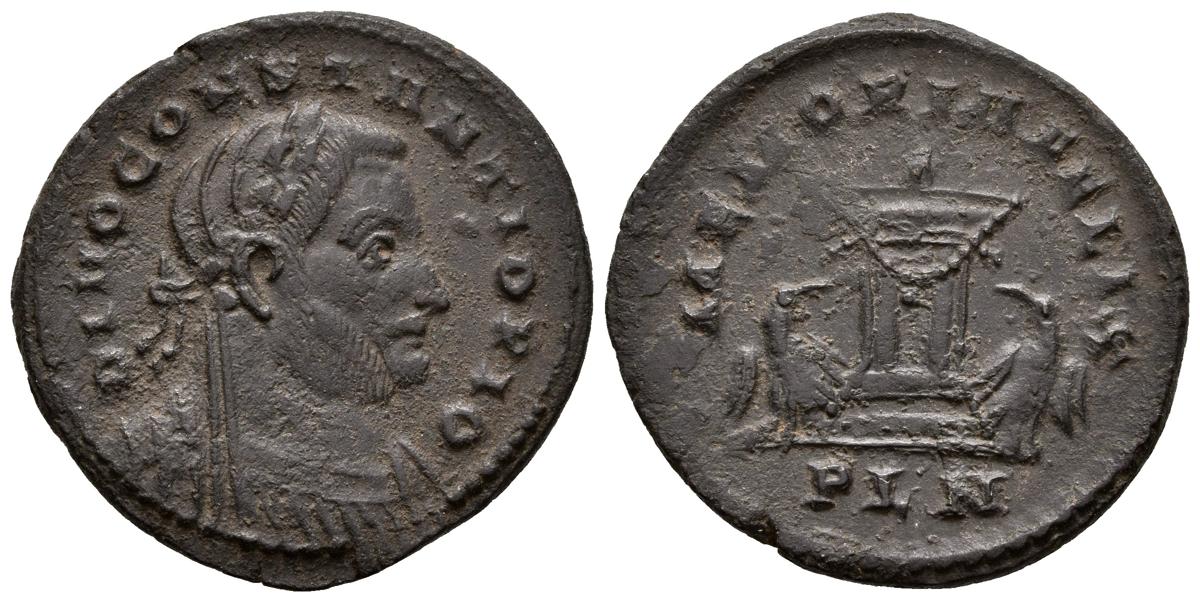 DIVUS CONSTANCIO I, acuñado por Contantino I. Follis. 307 d.C. Londinium. A/ Busto velado, laureado y drapeado con coraza a derecha. DIVO CONSTANTINO PIO. R/ Altar en llamas con guirnaldas, un águila a cada lado. MEMORIA FELIX, en exergo PLN. RIC 110 corr. (bust type). Ae. 6,78g. MBC+. Escasa.