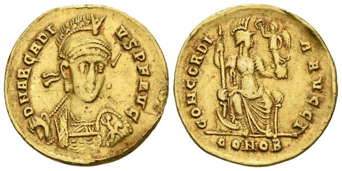 ARCADIO. Sólido. 397-402 d.C. Constantinopla. A/ Busto concasco y coraza de frente, girado ligeramente a la derecha, sosteniendo lanza y escudo decorado con jinete alanceando enemigo caido. D N ARCADIVS P F AVG. R/ Constantinópolis con casco sedente a derecha, sosteniendo cetro y Victoria sobre globo, reposa su pie derecho sobre proa. RIC 7; Depeyrot 55/1. Au. 4,33g. Golpecito en anverso. MBC.