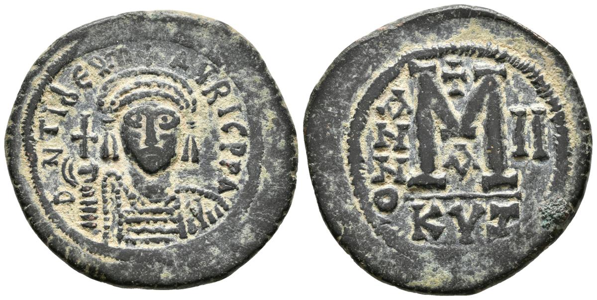 MAURICIO TIBERIO. 40 Nummi. 584-585 d.C. RY 2. Cyzicus. A/ Busto de frente con casco, sosteniendo globo crucífero. D N TIBER MAVRIC P P A. R/ En el centro M grande, encima cruz, debajo A, a ambos lados ANNO-II. En exergo KYZ. Sear 518. Ae. 13,05g. MBC+.