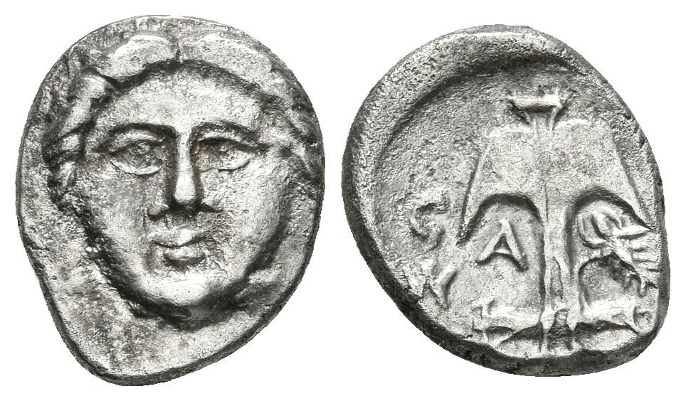 APOLLONIA PONTIKA, Thracia. Dióbolo. 410-341 a.C. A/ Gorgona. R/ Ancla, a izquierda A y a derecha cangrejo de río, en el campo izquierdo C W. SNG BM Black Sea 175. Ar. 1,20g. MBC/MBC+.