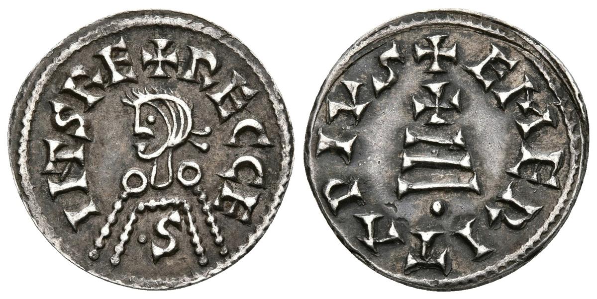 RECESVINTO. Tremissis. 653-672 d.C. Emérita (Mérida). A/ Busto a izquierda. RECCES INTS REX. R/ Cruz latina sobre grada. EMERITA PIVS. HILL 288. Ar. 1,81g. Falsificación de Carl Wilhelm Becker (1772-1830). EBC.