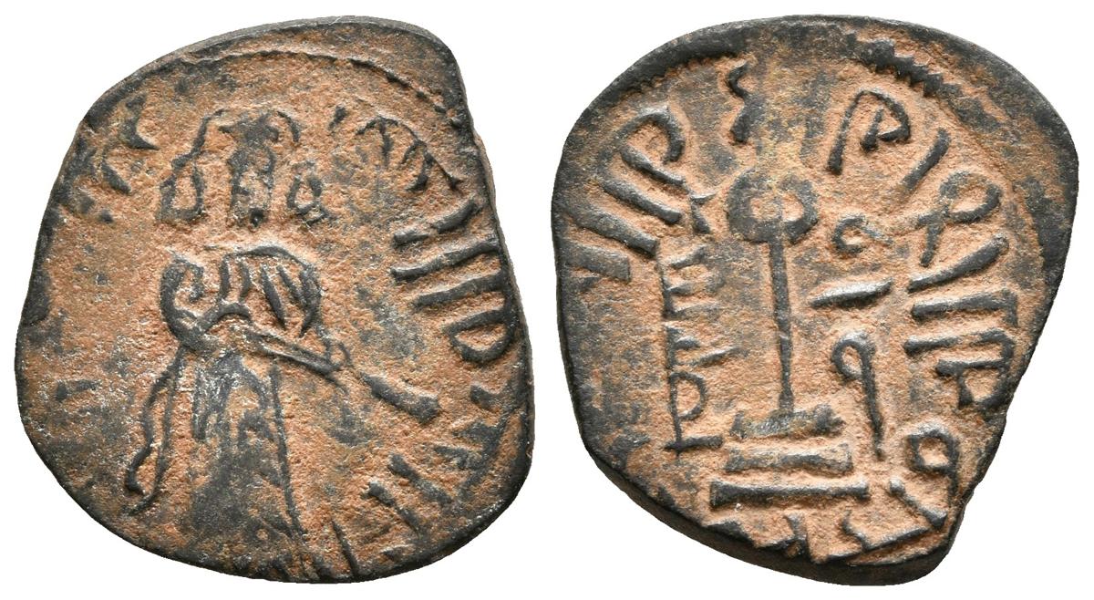 CALIFATO OMEYA. 'Abd al-Malik ibn Marwan. Felus. 690H. Qinnasrin. A/ Califa con barba en pie, colocando su mano derecha sobre el mango de su espada y látigo enrollado en el brazo derecho, alrededor 'li' abd allah' abd al-malik amir al-mu'minin'. R/ Cruz sobre tres peldaños, a ambos lados en Cúfico ´Sar´-´min´, alrededor 'la ilaha illa allah wahdahu muhammad rasul allah'. Album 3530; SICA I, 657. Ae. 1,71g. MBC+.