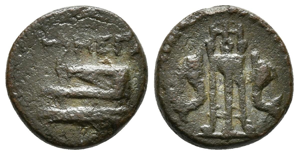 MEGARIS. Megara. Dichalkon. 275-250 a.C. A/ Proa a izquierda encima MErA. R/ Trípode entre dos delfines. BCD Peloponnesos 17; HGC 4, 1798. Ae. 1,77g. MBC-.