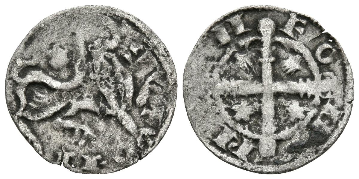 ALFONSO IX. Dinero. (1188-1230). Sancti Iacobi (Santiago de Compostela). SI superpuesta y cruz potenzada entre las patas. AB 130.3. Ve. 0,58g. MBC-. Escasa.