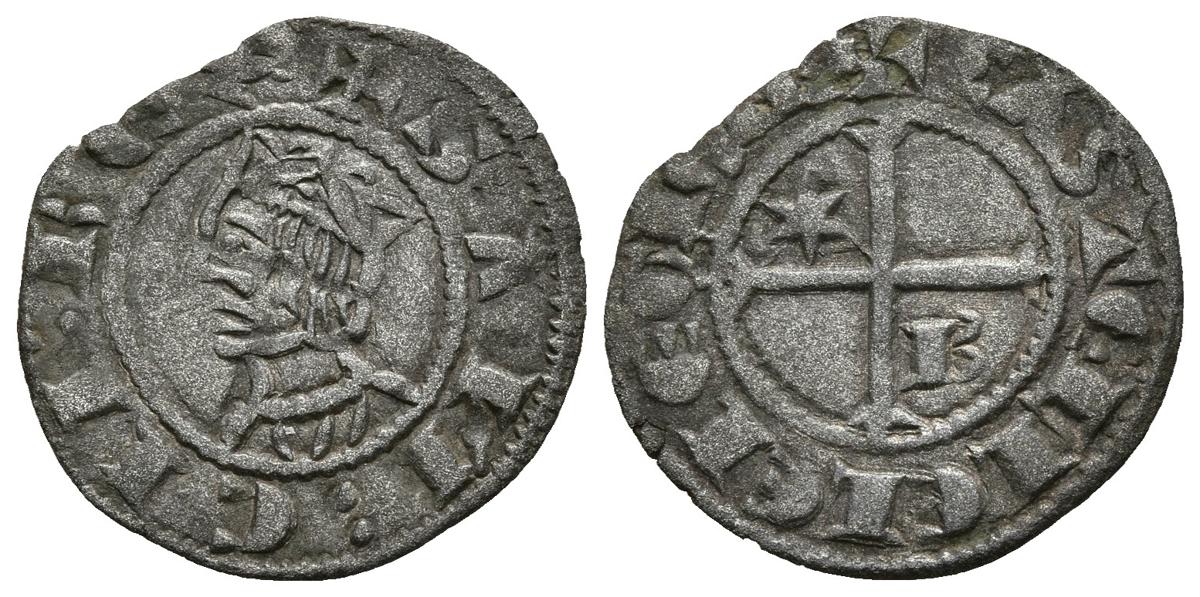 SANCHO IV. Meaja coronada. (1284-1295). Murcia. Marca estrella de seis puntas en primer cuartel y B en cuarto cuartel. AB 308.3 (como seisén); Mozo S4:6.11. Ve. 0,55g. Cospel levemente faltado. MBC.