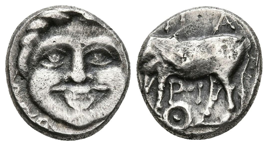 MYSIA, Parión. Hemidracma. Siglo IV a.C. A/ Toro a izquierda con cabeza vuelta a derecha, encima nA-RI, debajo círculo con punto en el centro. R/ Gorgona de frente. SNG France 1385-6; SNG von Aulock 7424. Ar. 1,61g. MBC+.