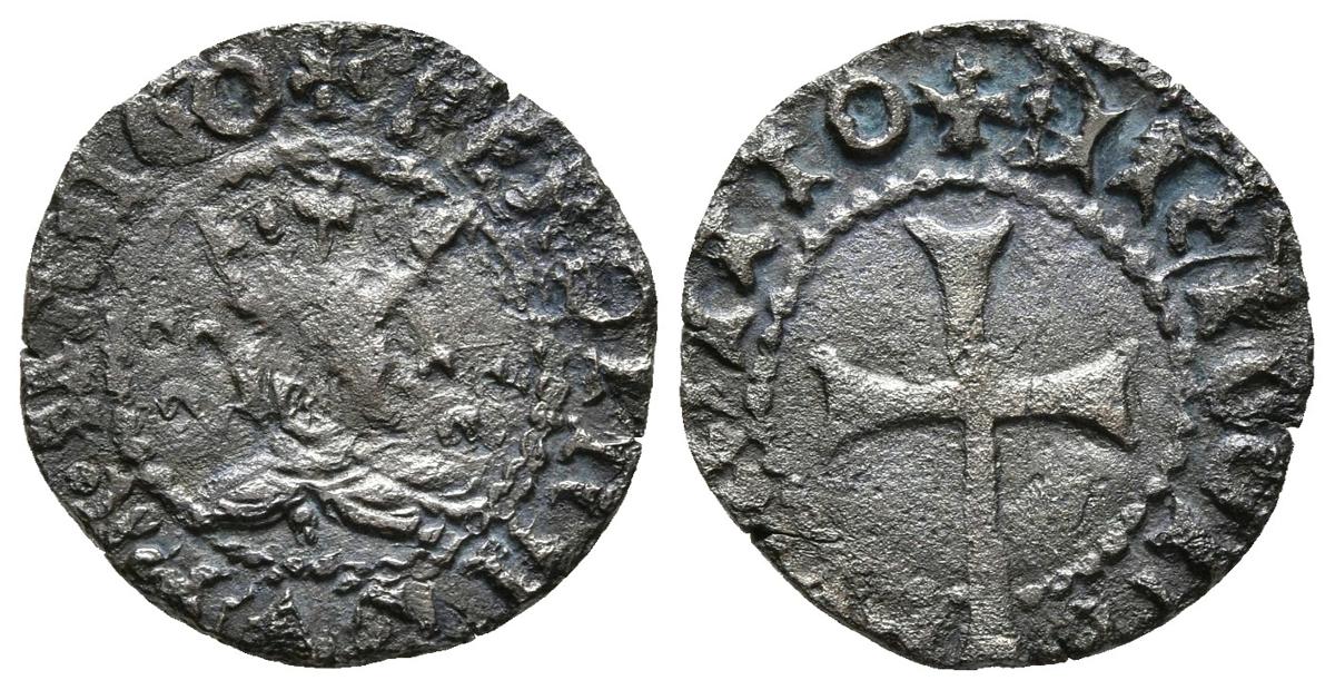 FERNANDO II. Diner. (1479-1516). Mallorca. Busto entre 3 crecientes. A/ Leyenda: + FERDINANDVS R·ARAGO. R/ Leyenda: + ARIGON (ET) MAIO. Cal-158; Cru.C.G. 3103. Ae. 0,95g. MBC. Rara.