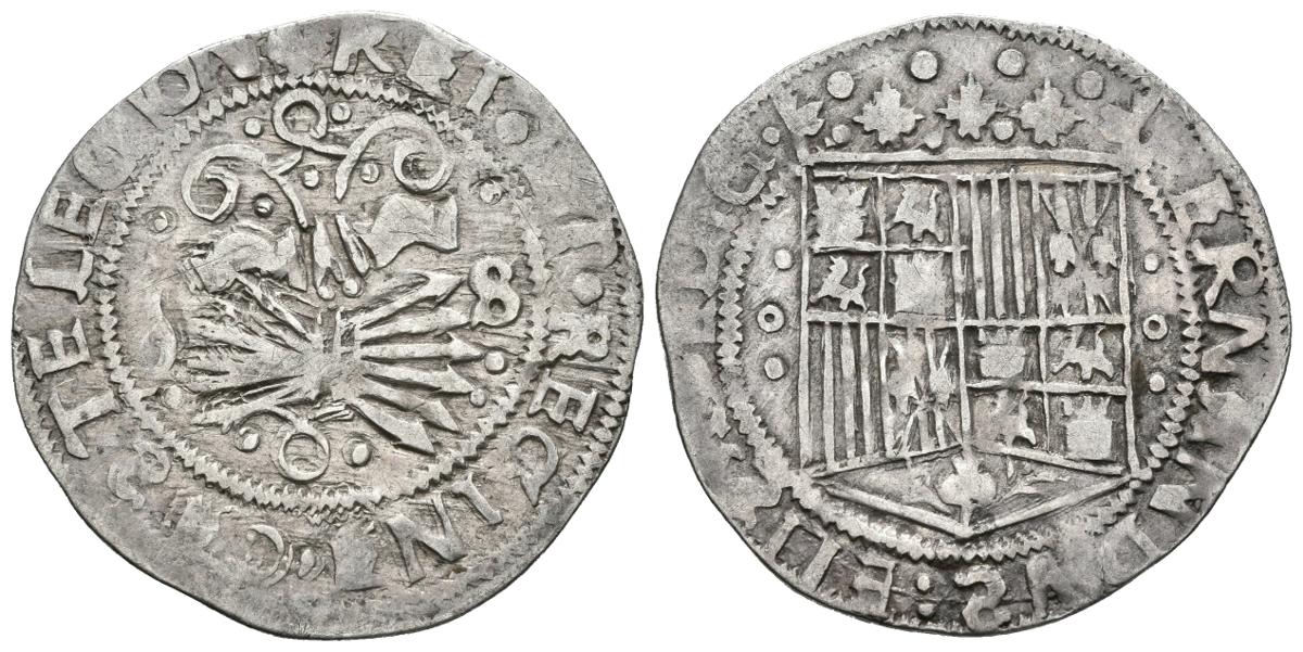 REYES CATOLICOS. 1 Real. (1474-1504). Sevilla. A/ Leyenda: + FERNANDVS : ELISABE D : G : (S invertidas y Corona con puntos gruesos). R/ Leyenda: (Hoja de parra) R ET · ¿? · REGINA · CASTE LEGION ( S invertidas). Cal-No cita; J. Luis López de la Fuente No cita. Ar. 3,32g. MBC-. Rara.