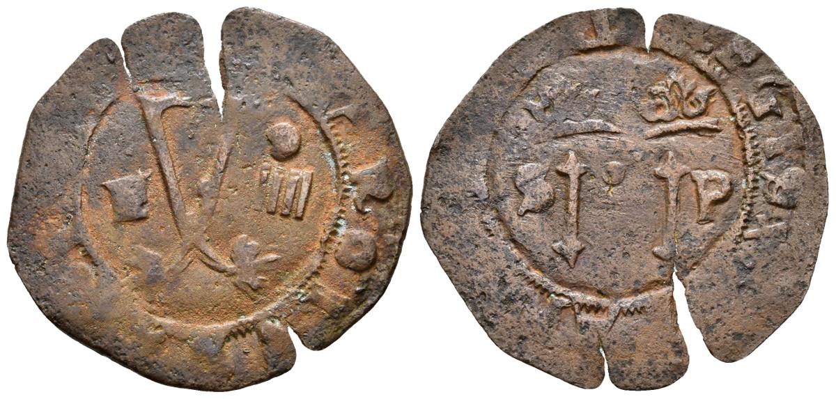 JUANA Y CARLOS. 4 Maravedís. (1504-1555). Santo Domingo. A/ F-IIII. R/ S-P. Cal-208. Ae. 2,55g. MBC-.