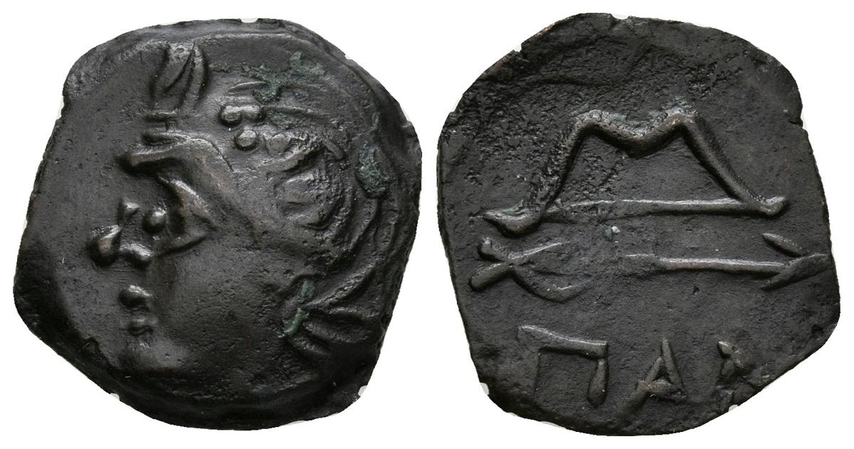 PANTIKAPAION. Ae15. 325-310 a.C. Bosporos. A/ Cabeza de sátiro sin barba a izquierda. R/ Arco sobre flecha, debajo nAN. MacDonald 116/1; SNG BM Black Sea 894. Ae. 2,06g. MBC+.