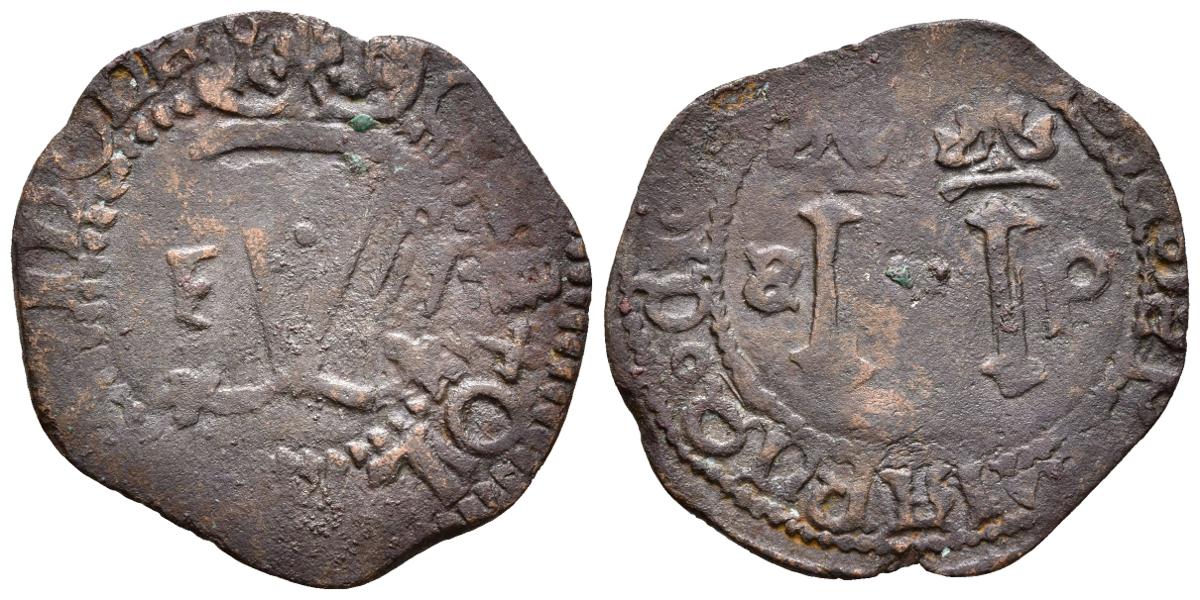 JUANA Y CARLOS. 4 Maravedís. (1504-1555). Santo Domingo. A/ F-4. R/ S (Invertida)-P. Cal-211var. Ae. 2,64g. MBC-.