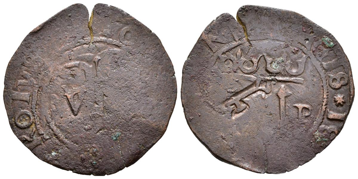 JUANA Y CARLOS. 4 Maravedís. (1504-1555). Santo Domingo. A/ F-4. R/ S-P. Resello de llave (De Mey 830), realizado en 1577 por instrucción de la Audiencia de Santo Domingo, para circular por 2 Maravedís, su valor inicial. Cal-211. Ae. 3,707g. BC+. Escasa.