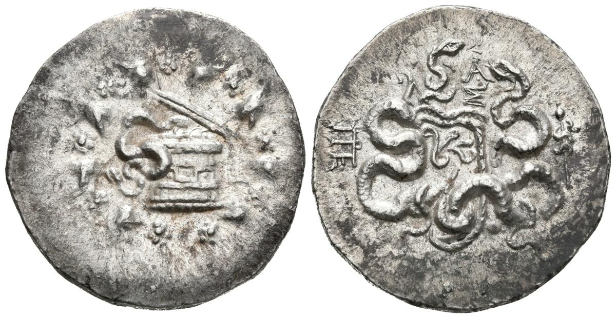 PERGAMON, Mysia. Cistophoro. 104 a.C. A/ Cista mística con una serpiente, rodeada de corona de yedra. R/ Arco entre serpientes, rodeado de corona de yedra, sobre la corona monograma AE, a derecha Thyrsos entrelazado por una serpiente. SNG France 1713. Ar. 12,70g. MBC+/EBC.
