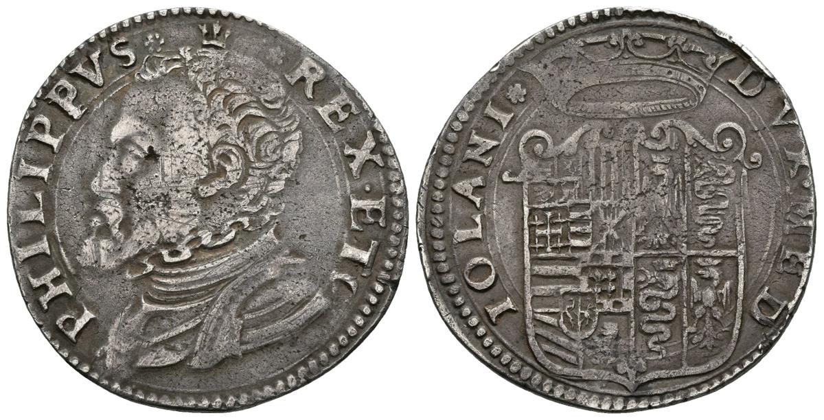 FELIPE II. 20 Soldi. 1556-1598. Milán. A/ Busto a izquierda con coraza y lechuguilla en el cuello. PHILIPPVS REX ET C. R/ Escudo de armas coronado. DVX MEDIOLANI. CNI 355/370; Cr. 35/a; MIR 320/4. Ar. 6,22g. MBC+. Muy rara.