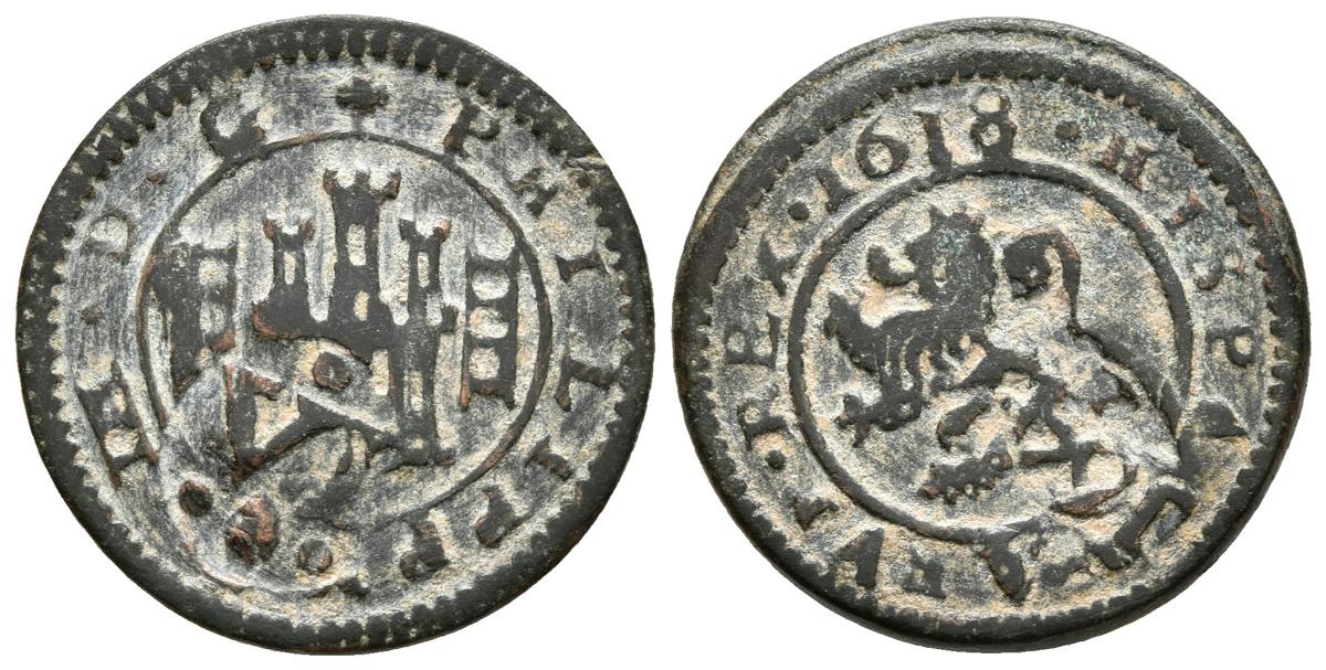 FELIPE III. 4 Maravedís.1618. Segovia. Resello de VI maravedís de Coruña 1641. (J.S. H-9). Cal-823. Ae. 2,89g. MBC.