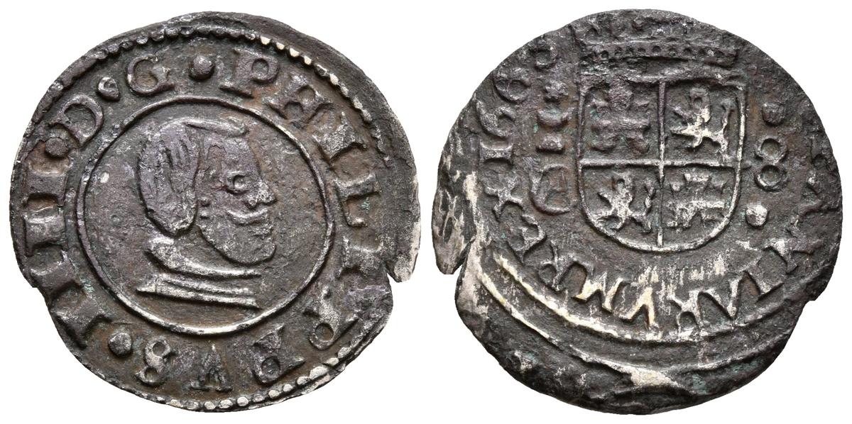 FELIPE IV. 8 Maravedís. 1663. Cuenca CA. Valor entre puntos gruesos. Cal-1304; J.S. M-207. Ae. 1,75g. MBC-.