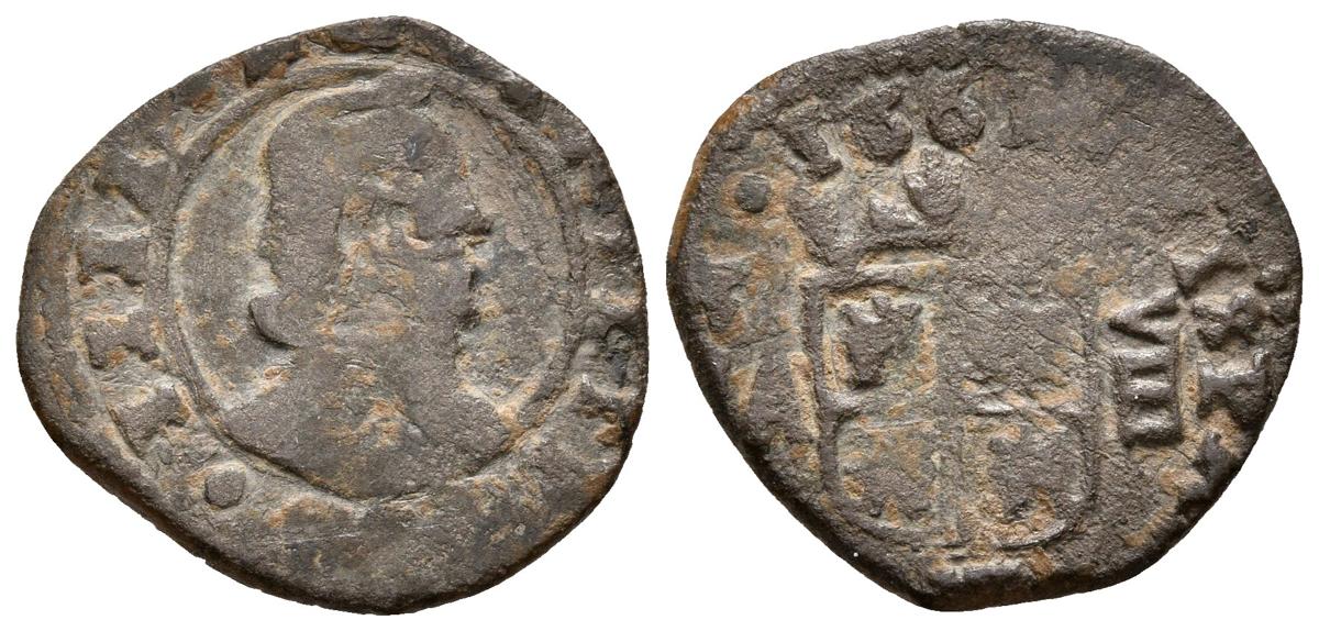 FELIPE IV. 8 Maravedís. 1661. Madrid A. Acuñada a martillo. Cal-1416 J.S. M-285. Ae. 1,80g. BC+. Rara.