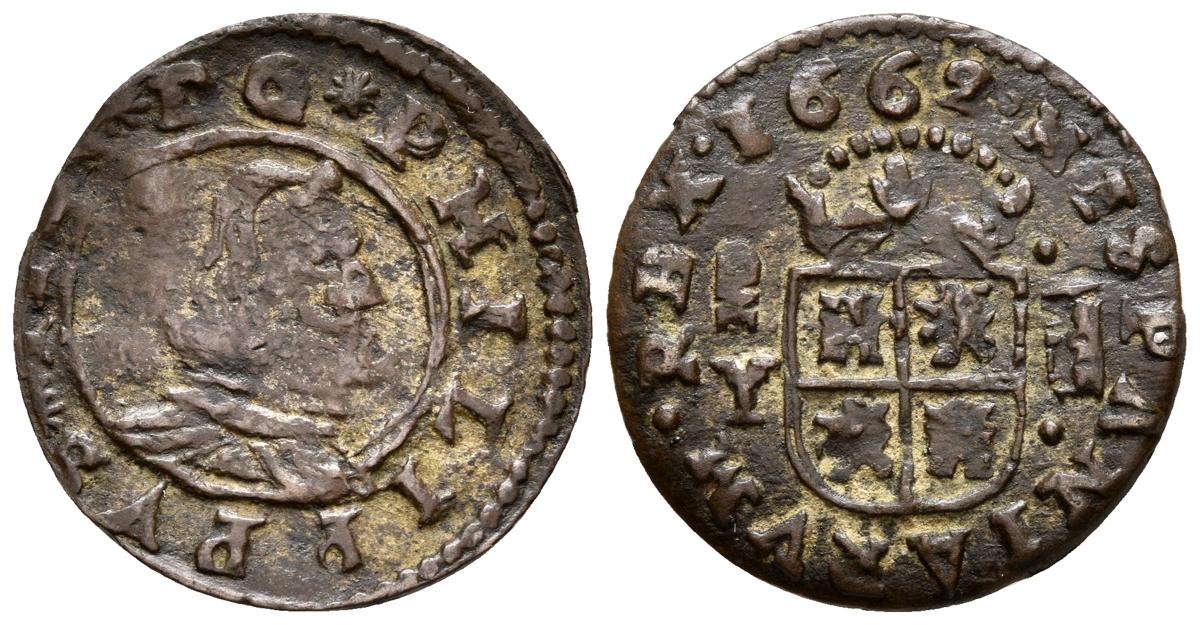 FELIPE IV. 8 Maravedís. 1662. Madrid Y. Acuñada sobre otra moneda de 8 Maravedís. Cal-1424; J.S. No cita. Ae. 2,10g. MBC-/MBC. Rara.