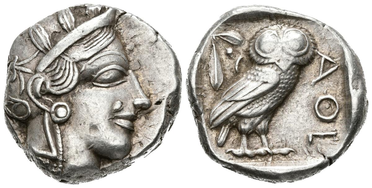 ATTICA. Athenas. Tetradracma. 454-404 a.C. A/ Cabeza de Athena a derecha con collar y casco ático con cresta y decorado con tres hojas de olivo. R/ Búho parado a derecha con la cabeza de frente, rama de olivo y media luna detrás, delante AOE. Kroll 8; Dewing 1591-8; SNG Copenhagen 31. Ar. 17,19g. MBC+.