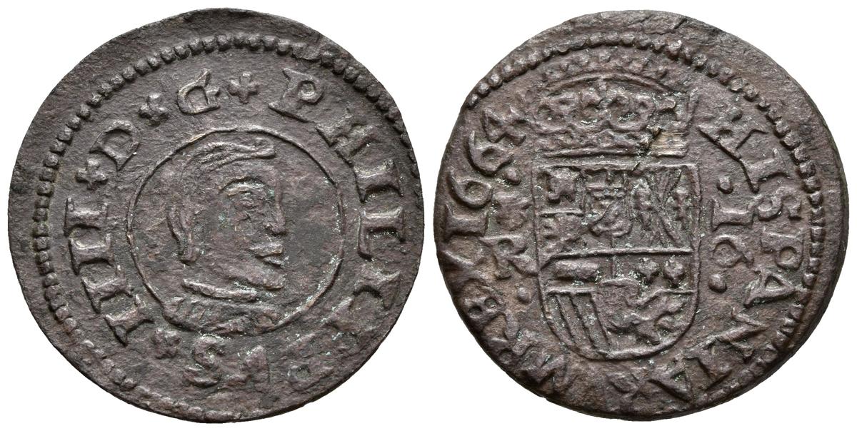 FELIPE IV. 16 Maravedís. 1664. Coruña R. Cal-1302; J.S. M-132. Ae. 4,35g. MBC-.